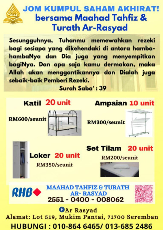 Segala puji bagi Allah swt, sumbangan anda semua sebelum ini telah dapat kami dirikan sebuah surau untuk kegunaan sesi pembelajaran yang akan datang pada Januari 2022 nanti. Justeru daripada itu, dengan kemasukan para pelajar baru yang kami akan ambil nanti, kami memohon sumbangan untuk kelengkapan asrama bagi kemudahan anak-anak syurga ini sepanjang berada di Maahad Tahfiz & Turath Ar Rasyad.